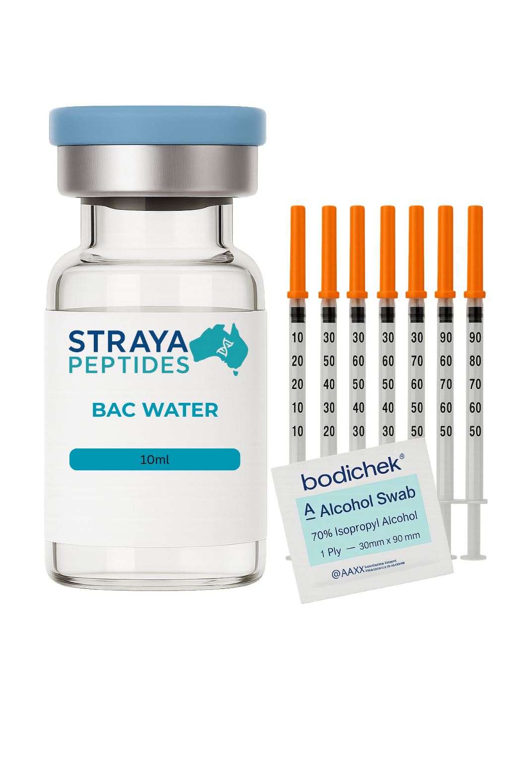 The Starter Kit includes essential laboratory supplies: 5 sterile insulin syringes, 4 alcohol swabs, and 10ml of bacteriostatic water. All components are research-grade and COA-verified where applicable. For laboratory use only.